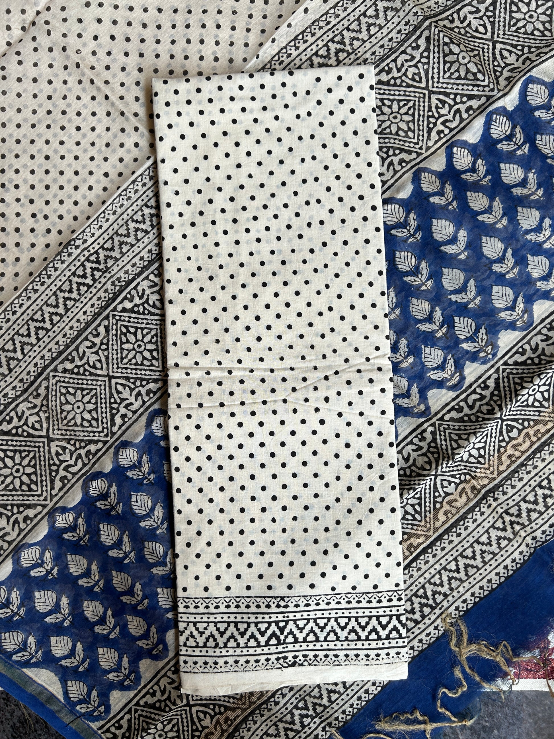 - Top: Navy blue Chanderi silk with delicate white blockprint motifs
