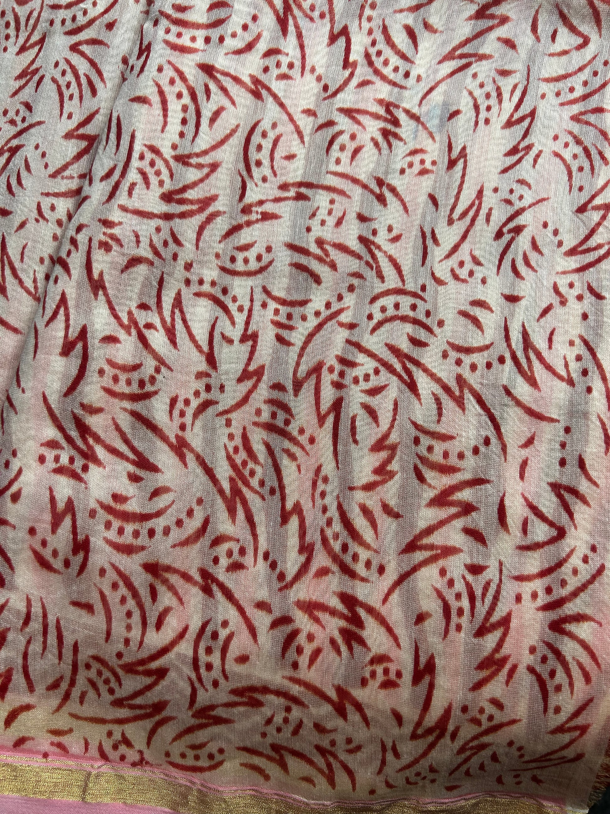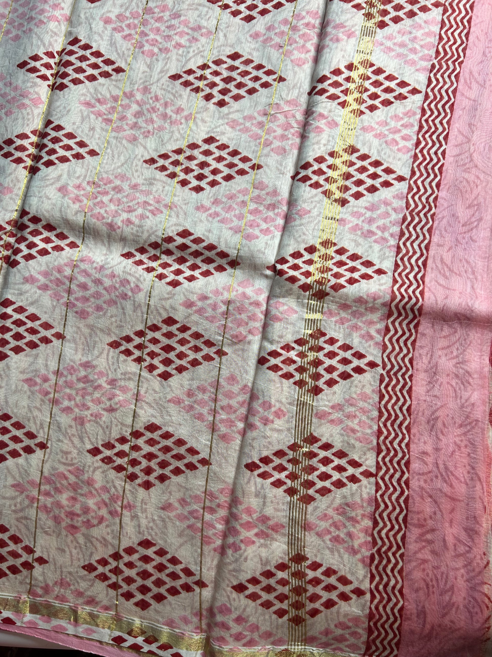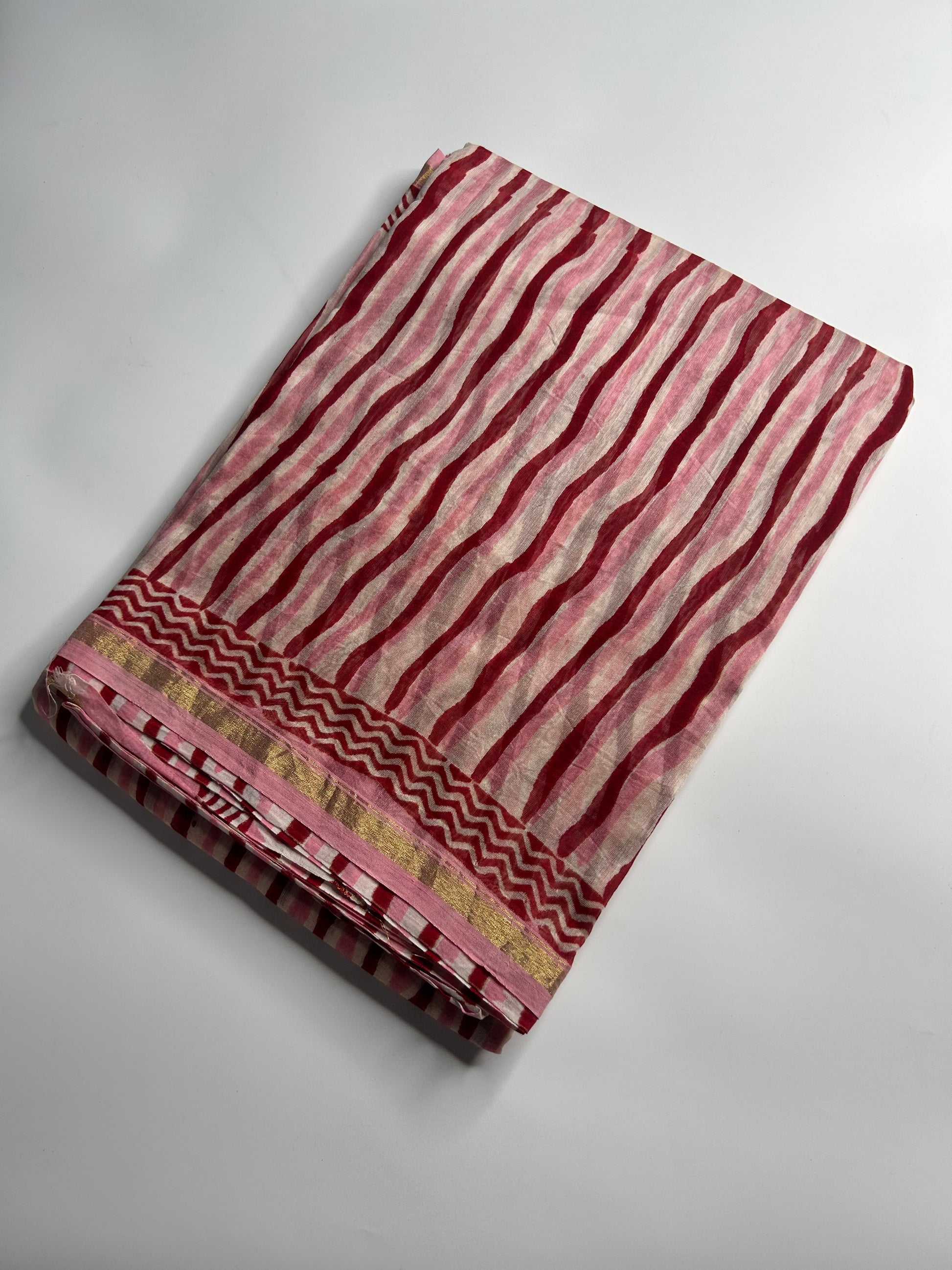 A lightweight Chanderi silk cotton saree in playful bubblegum pink, featuring elegant stripes. Chic, breathable, and perfect for festive wear or graceful everyday draping. Comes with a matching blouse piece.