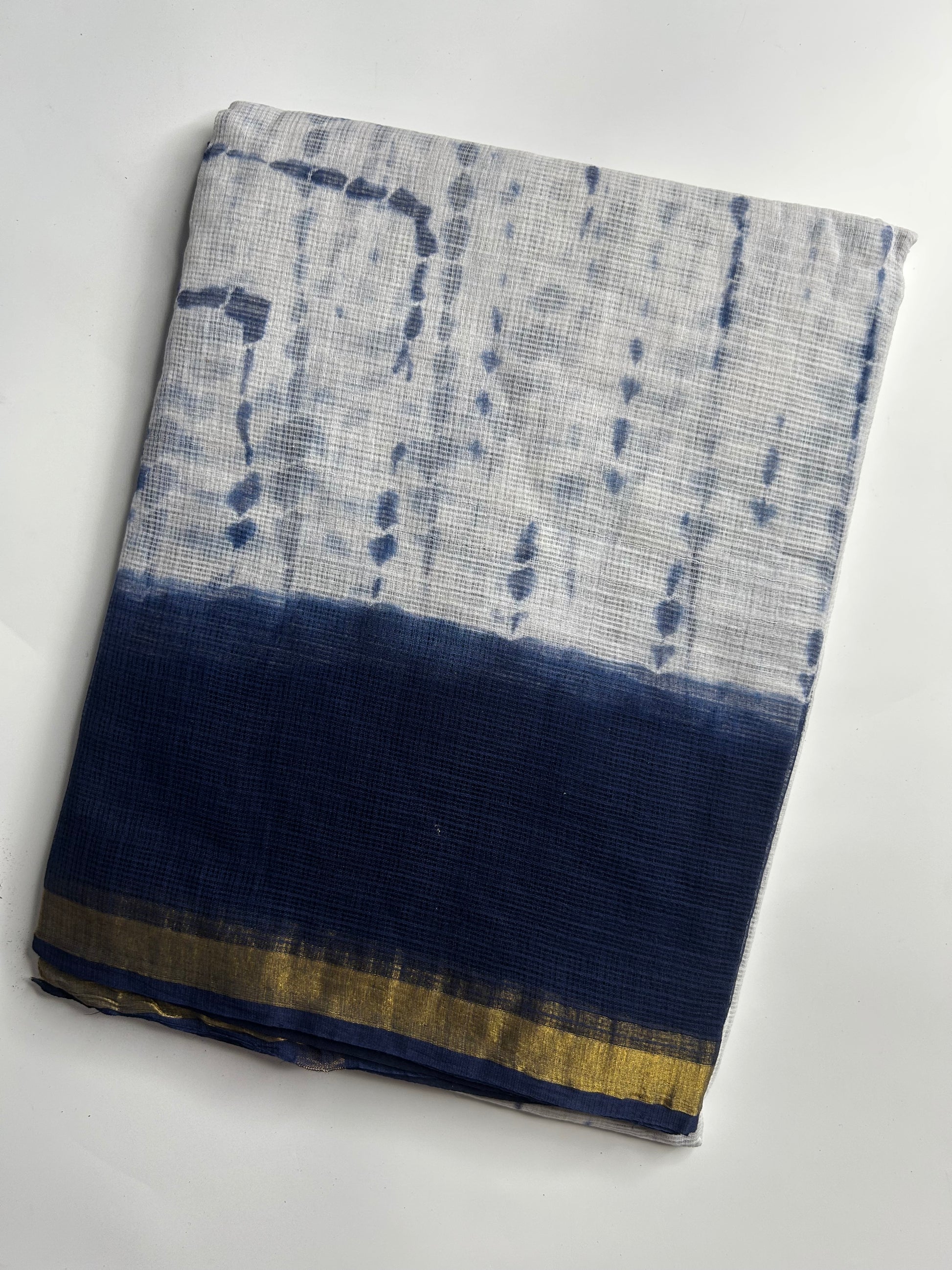 Effortlessly chic, this handwoven Kota Doria saree features a refreshing white base with indigo blue Shibori patterns. The tie-dye effect adds a contemporary touch to the traditional airy Kota weave, making it perfect for both casual gatherings and elegant occasions. Lightweight and breathable, it drapes beautifully while keeping you comfortable all day.