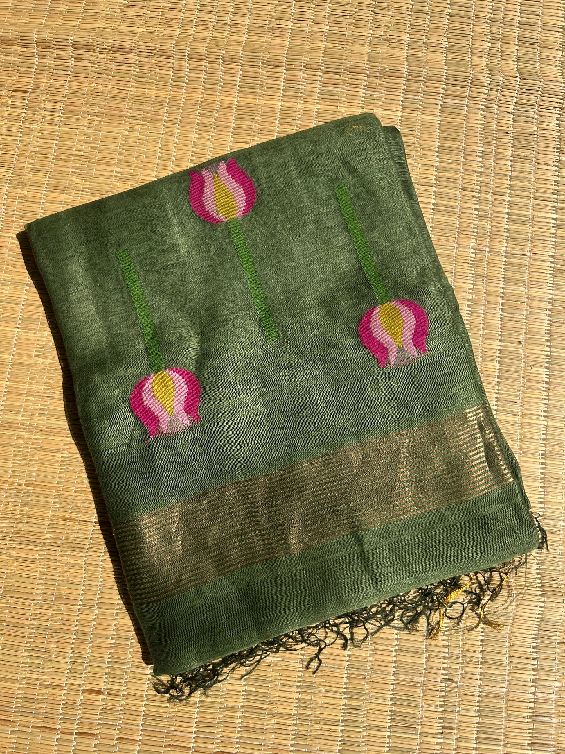 Green silk linen jamdani saree with lotus motifs