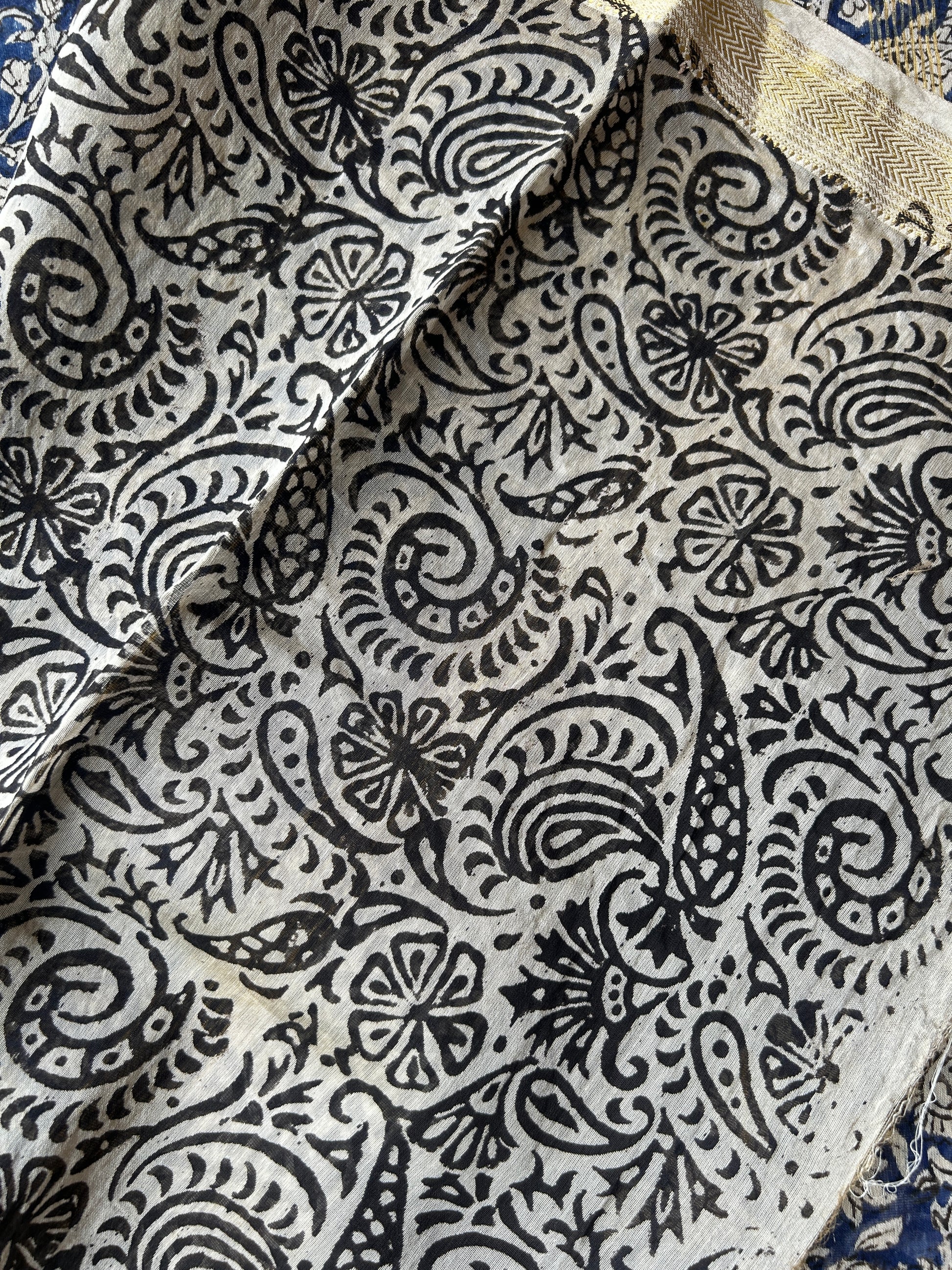 Crafted from soft, lustrous Maheshwari silk, the saree features delicate blue floral patterns, hand-stamped by skilled artisans using age-old wooden blocks. The red block with blacks dots design creates a rich, textural depth — a quiet elegance that feels both classic and contemporary.