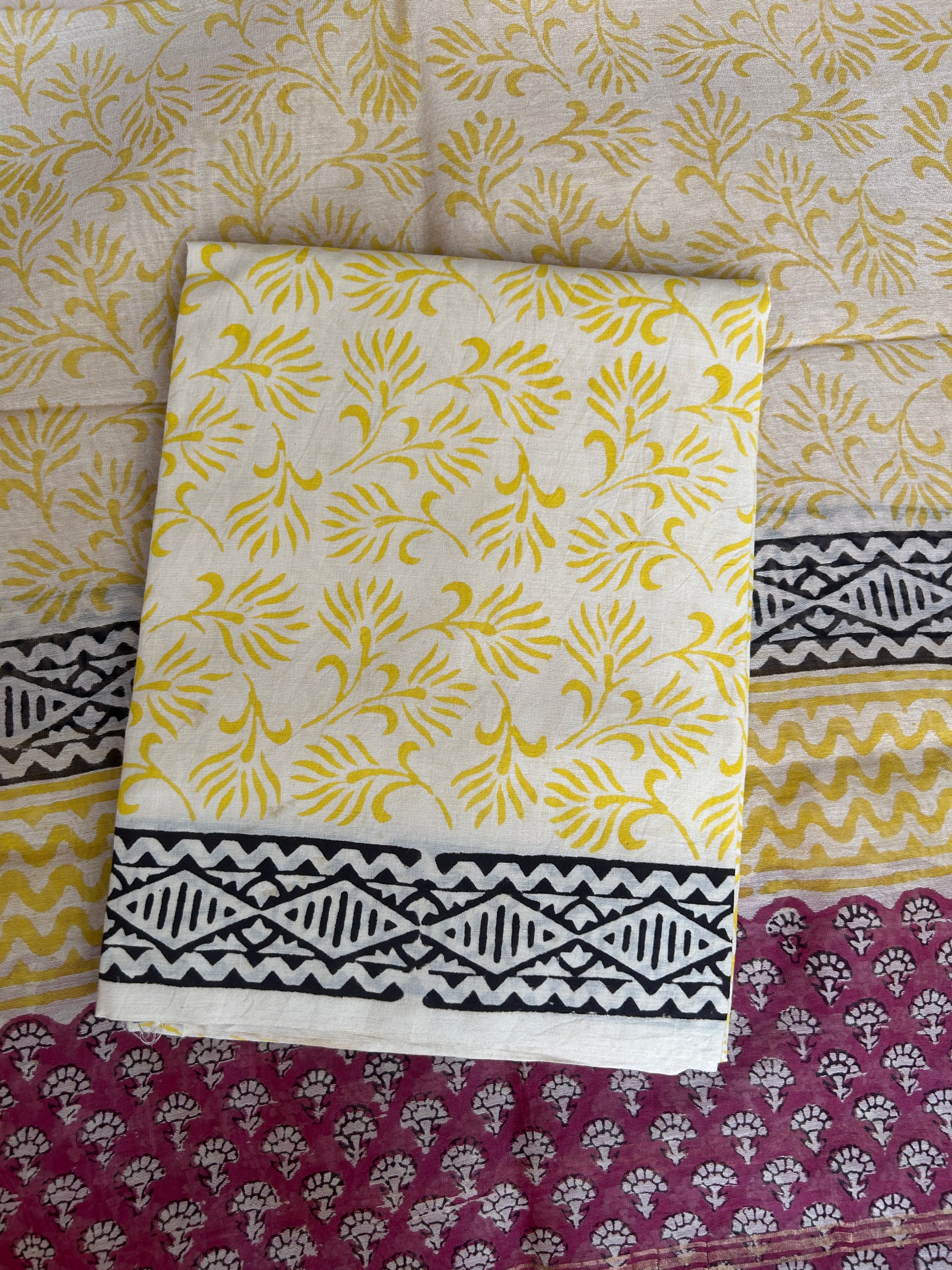 - Bottom: Lemon yellow fabric with floral motifs and a black border