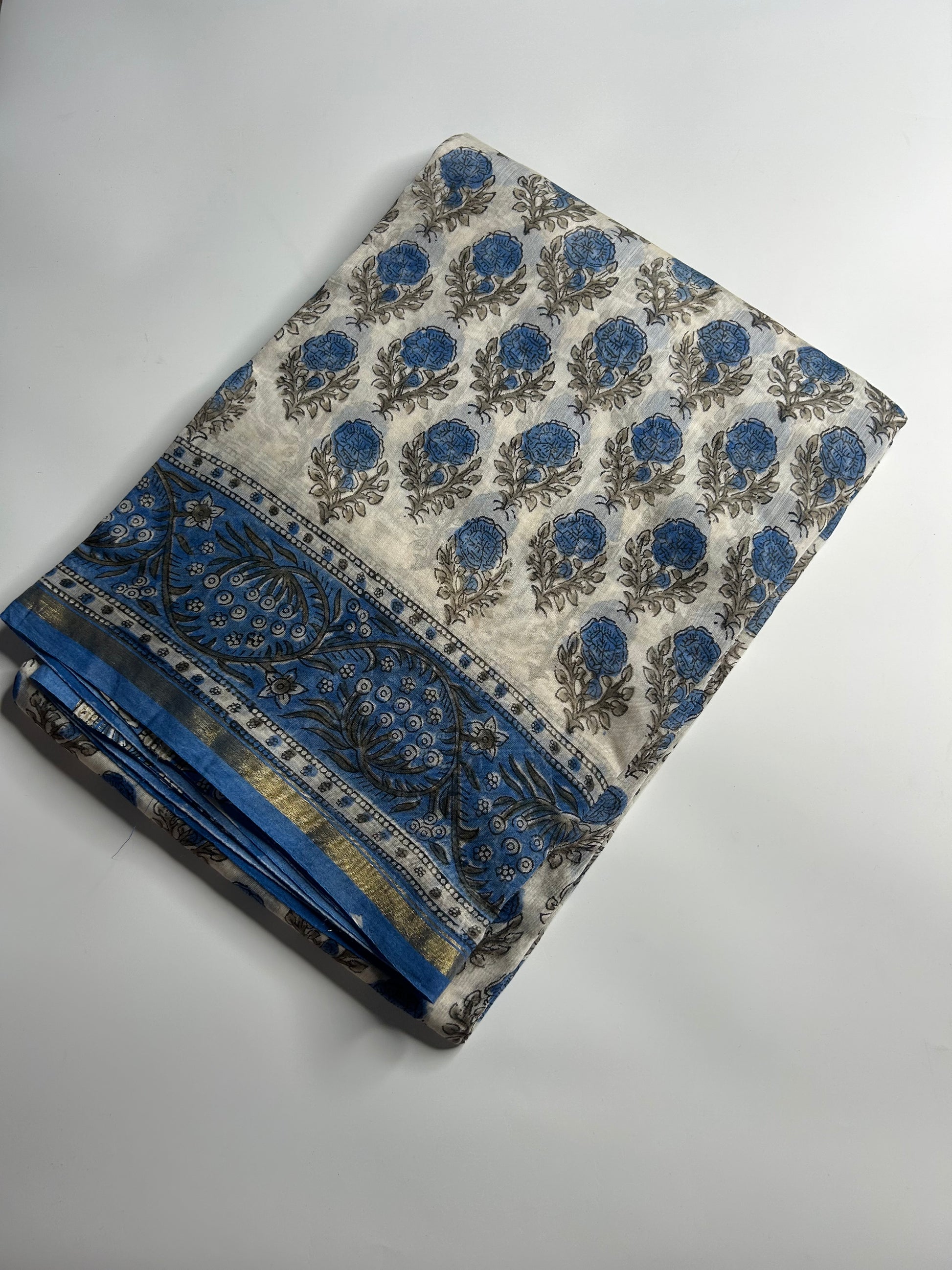 A lightweight Chanderi silk cotton saree in pristine white, adorned with delicate blue floral motifs. Elegant, breathable, and perfect for festive wear or graceful everyday draping. Comes with a matching blouse piece.